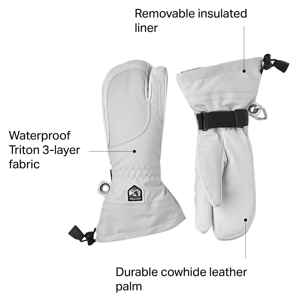 Find yourself in powder paradise when you’re skiing fresh snow in the warmth and protection of the Hestra Women’s Heli 3-Finger Gloves. Their waterproof construction and extended coverage keep your fingers bone-dry when the snow is flying up over your head with every turn, and removable insulated liners keep your hands toasty when temperatures plummet and the powder is lighter than air. Triton three-layer fabric on top seals out snow while allowing breathability so your hands don’t get soaked with sweat, and leather palms offer excellent pole-gripping dexterity while ensuring your gloves last for many seasons to come.